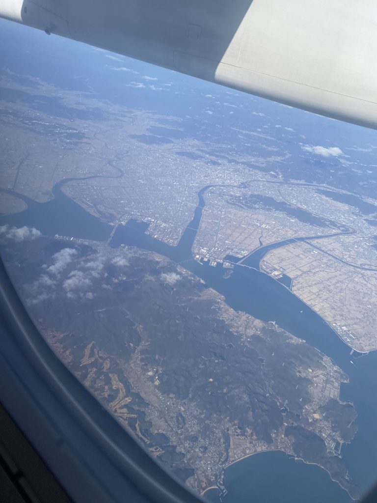 大阪の伊丹空港から大分空港へは、約1時間のフライト。もしかしたら瀬戸内海の島々を見れるかも、と期待していましたが、残念ながらそれは叶いませんでした。また、伊丹-大分便は、Wi-Fiが搭載されていない機種でした。スマートフォンやタブレットで、動画を楽しんでいる旅慣れた人もいて、動画の1つでもダウンロードしておけばよかった、とたいへん勉強になりました。