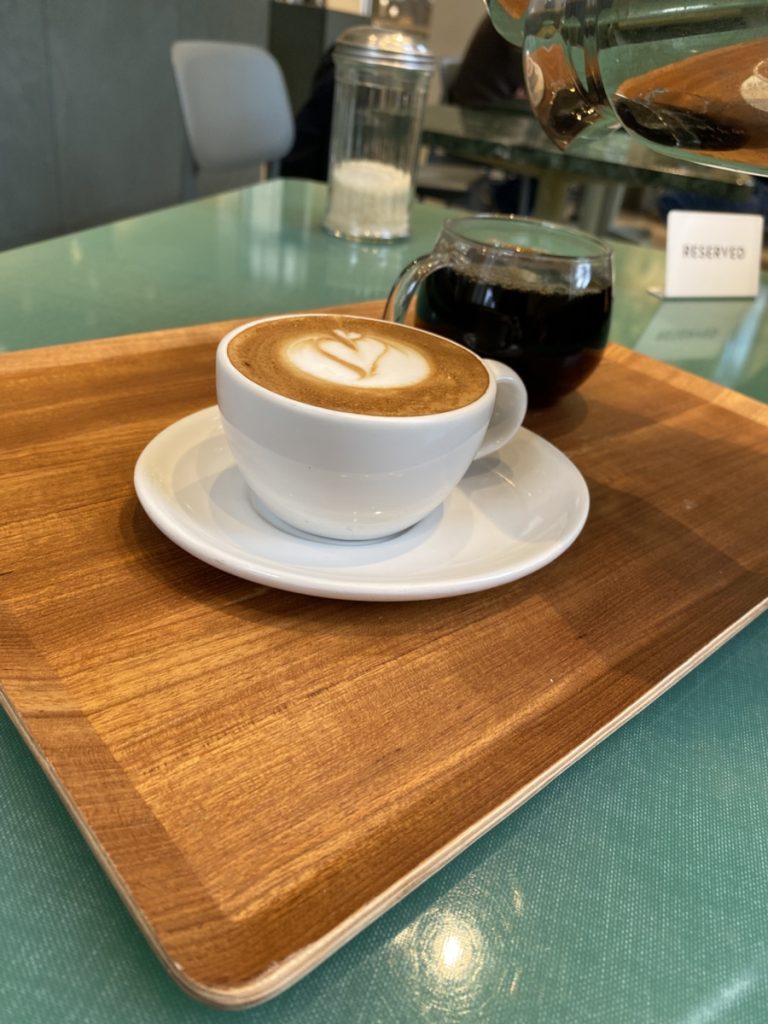 私はカフェラテを注文。クレマがきめ細かく、フォームミルクの香りが心地よい。少しぬるめでしたが、美味しくいただきました。朝はコーヒー派の私にとって、これがないと一日が始まりません。焼き菓子も美味しそうでした!