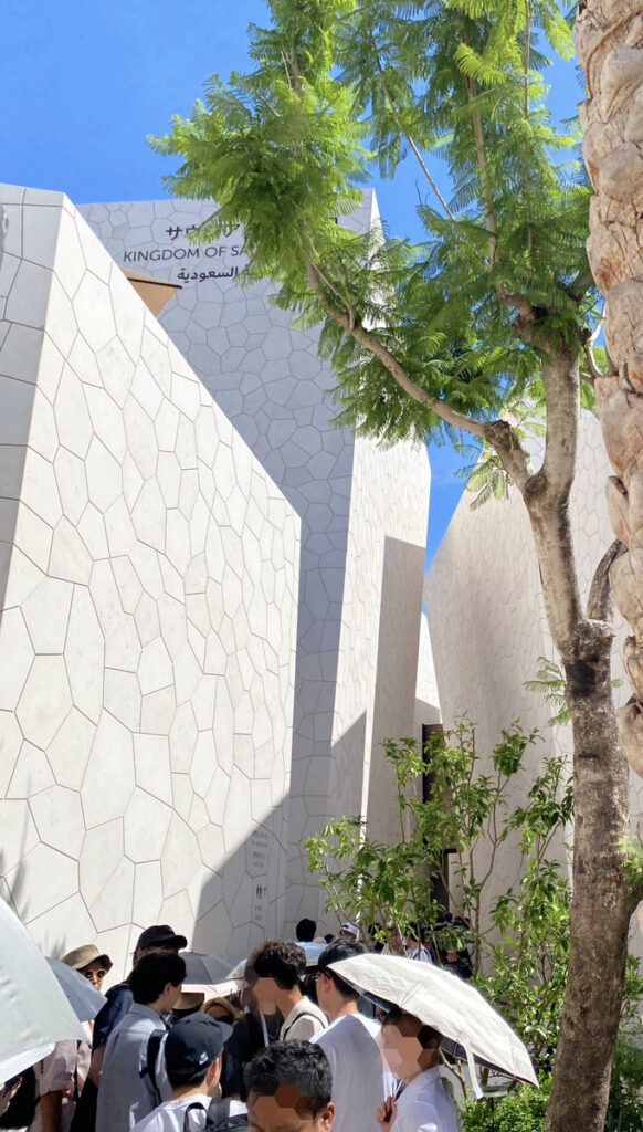 とりあえず、お昼過ぎにまずはパビリオンも楽しもうと、サウジアラビア館へ向かいました。1時間ほど並び、館内の展示などをひととおり楽しみつつ出口を出ると、ようやくレストランの行列らしきものを発見。それが、「29番の柱」付近にできていた列でした。